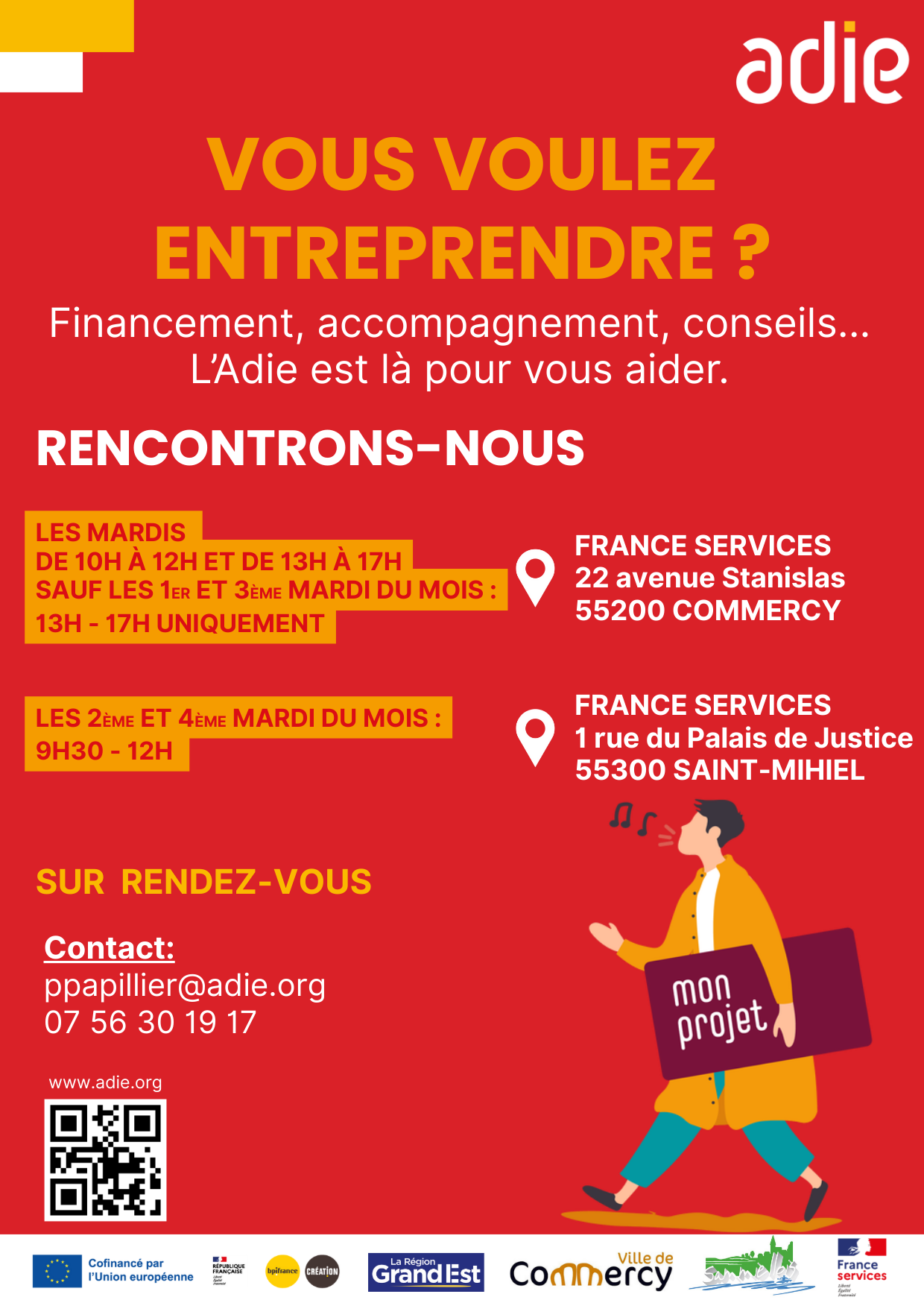 Dans cette dynamique, et pour renforcer notre présence sur le territoire, je souhaiterais assurer une permanence à France Services Saint-Mihiel un mardi matin sur deux, afin d'accueillir les personnes intéressées par la création d'entreprise ou le développement de leur activité.