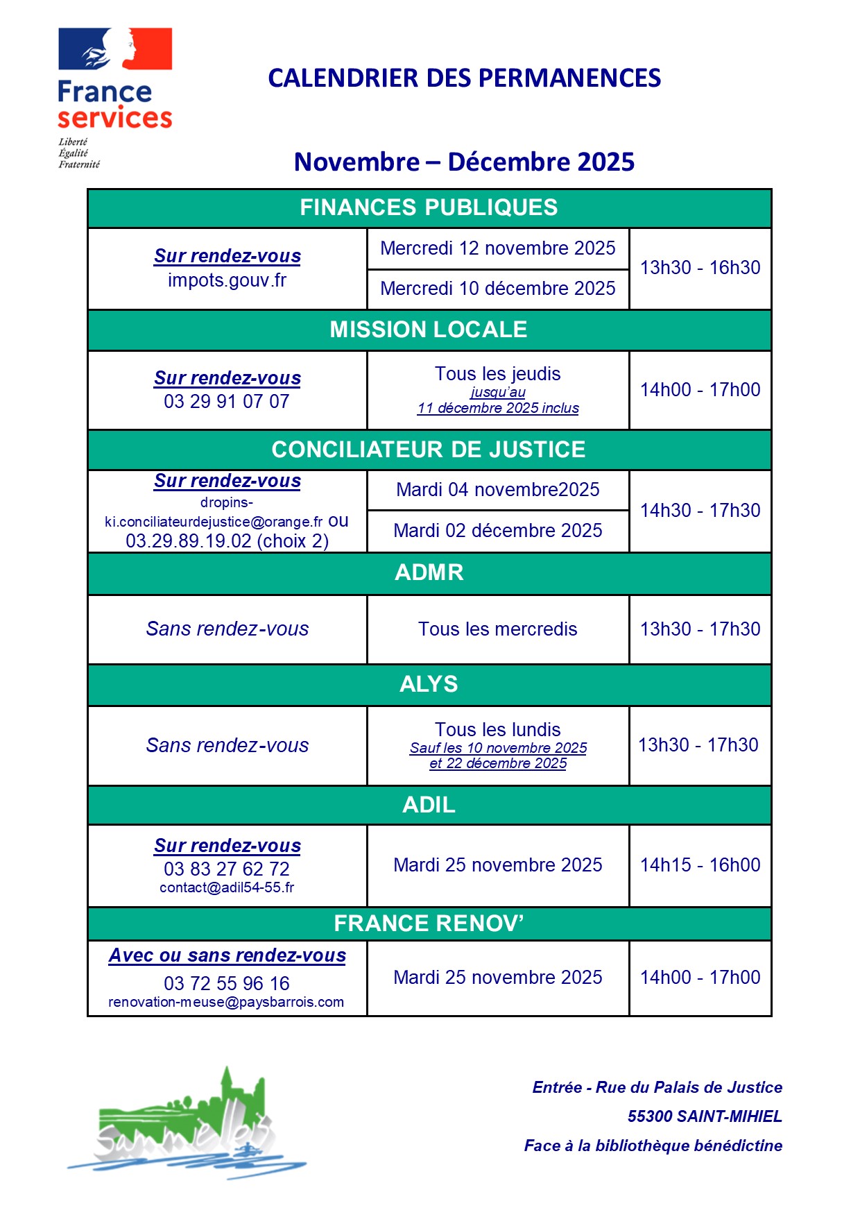 Pas de permanence de l'ADMR à France Services les mercredis 17, 24 et 31 décembre 2025. Elle se tiendra à Lacroix sur Meuse 39 rue du Général de Gaulle.