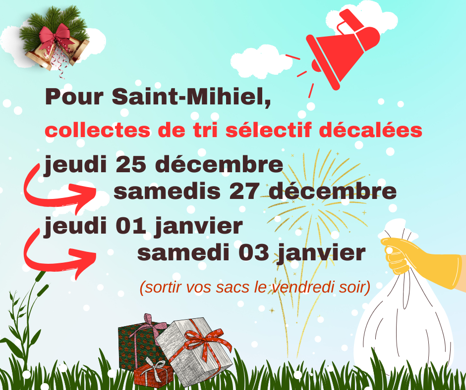 Pour Saint-Mihiel, les collectes de tri sélectif des jeudis 25 décembre et 1er janvier sont reportées aux samedis 27 décembre et 03 janvier (sortir les sacs le vendredi soir). Les collectes des bacs OMR des vendredis 26 décembre et 02 janvier restent inchangées (sortir les bacs le jeudi soir).